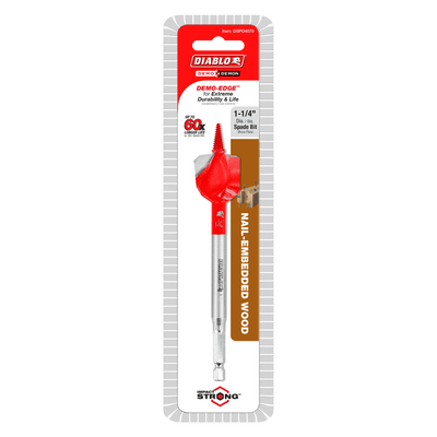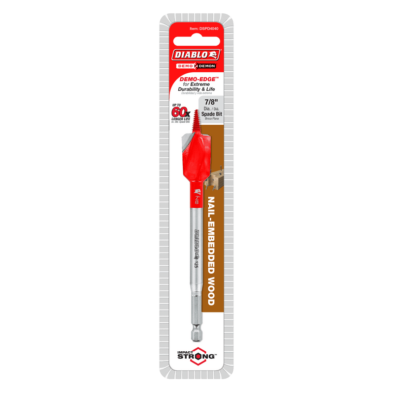 Diablo's Demo Demon Spade Bits provide one of the most durable, effortless, and longest lasting hole drilling solutions on the market for nail-embedded wood. The DEMO-Edge dual cutting edges coupled with a self-feeding Dura-Tip power through nail hits for a smooth drilling experience and up to 60X longer life. An optimized curved paddle design enhances the chip evacuation process for more holes per charge. This range is Impact Strong for increased shank stability and durability in cordless and corded impact and drill drivers.