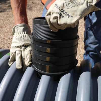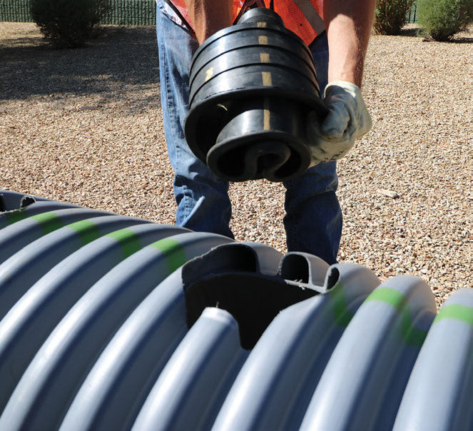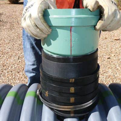 Inserta Tee is a three piece service connection consisting of a PVC Hub, Rubber Sleeve and Stainless Steel Band. Inserta tee is compression fit into the cored wall of a mainline and requires no special tooling. Inserta Tees are designed to connect 2" through 30" laterals to all known solidwall, profile, closed profile, corrugated pipe and manhole structures manufactured today.