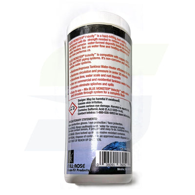 BLUE MONSTER Velocity is a hard-hitting, fast-acting compound with the strength needed to remove scale, lime, rust, and other corrosive water-formed deposits inside on-demand water heaters. Velocity contains sulfamic acid, a highly-effective agent used to clean heat exchangers, boilers and condensers. Restore water flow and heating efficiency for like-new performance with Velocity.
