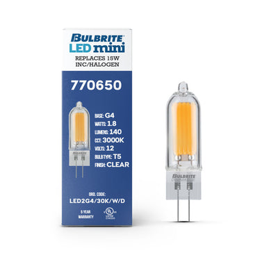 - Included in this package are four dimmable T5 LED bulbs, each 1.8 watts, in a soft white light 3000K color temperature with a G4 bi-pin base and a Clear glass finish.