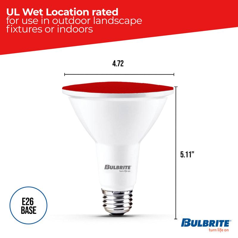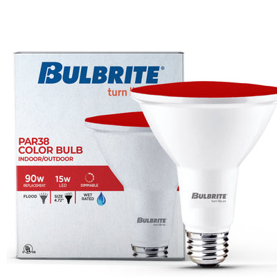 This Bulbrite LED color PAR38 bulb delivers a splash of red color ideal for parties, holidays or events. These wet rated long lasting fully dimmable light bulbs are suited for indoor or outdoor use. Light up your next event or show support for your favorite charity or cause with a splash of color that lasts up to 25,000 hours.