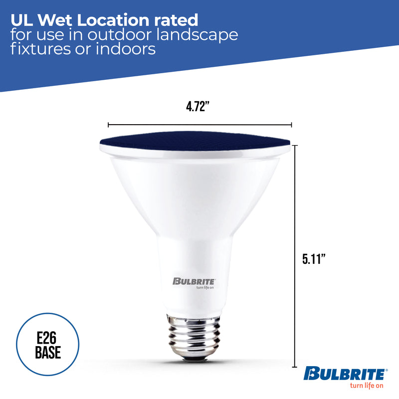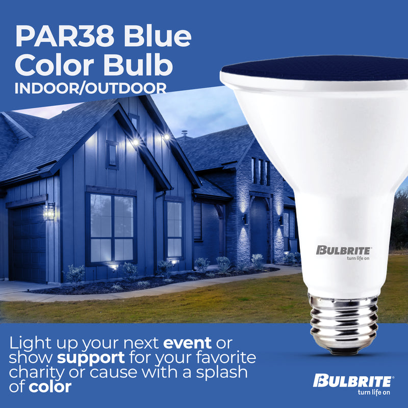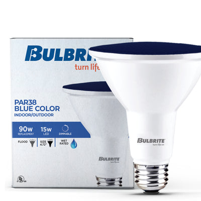 This Bulbrite LED color PAR38 bulb delivers a splash of blue color ideal for parties, holidays or events. These wet rated long lasting fully dimmable light bulbs are suited for indoor or outdoor use. Light up your next event or show support for your favorite charity or cause with a splash of color that lasts up to 25,000 hours.