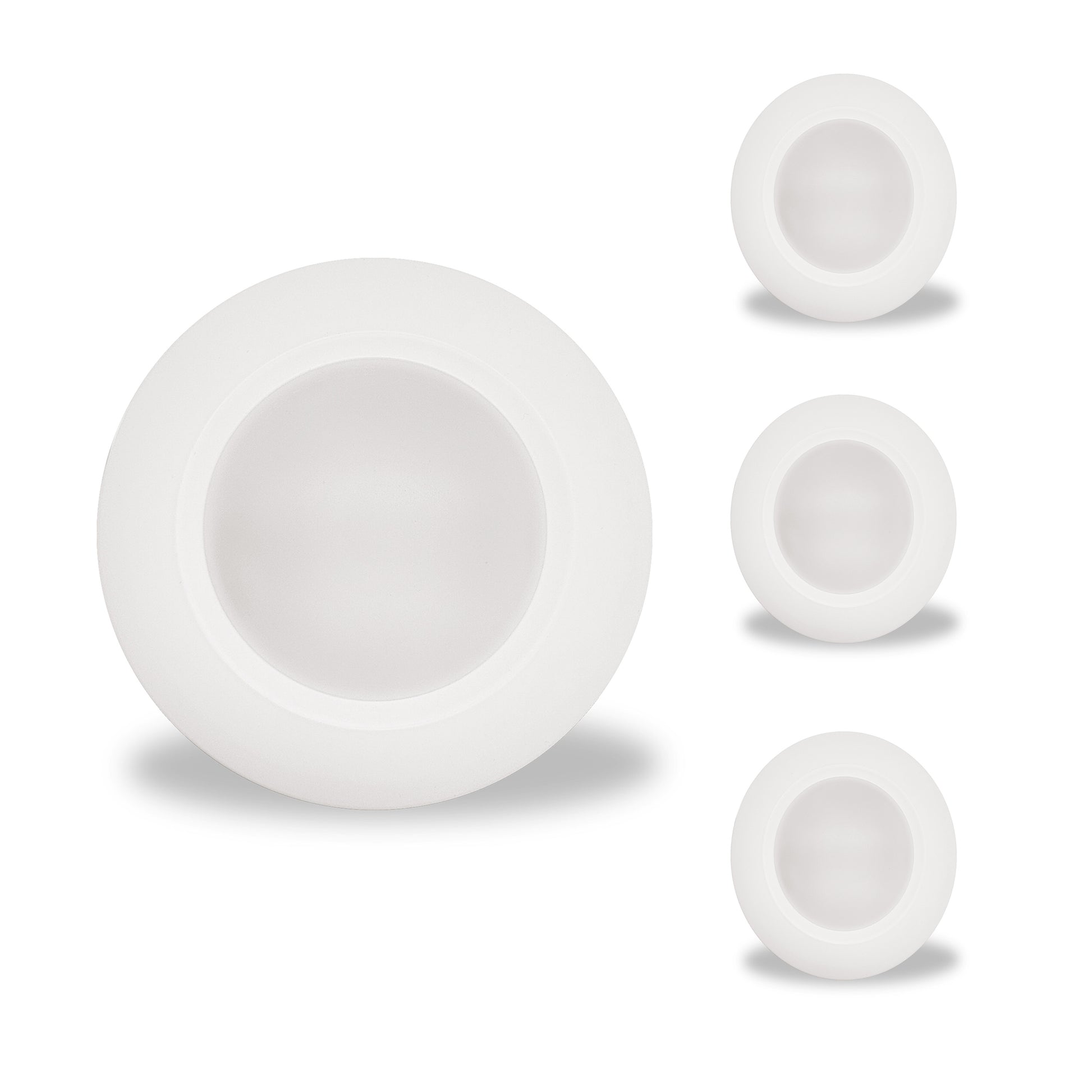 This 4-pack of 14 watt 7” LED 5CCT Selectable Disc Lights features a versatile design in a white aluminum trim, suitable for damp locations and that fit standard 3.5" and 4" J-Boxes, allowing for an easy and quick installation for both remodels and new construction and allowing users and installers to choose the tone of white light they desire before installation.