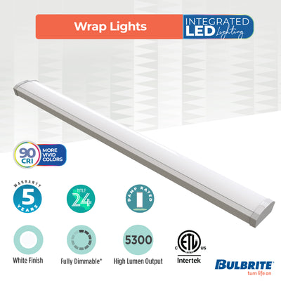 Our modern low profile integrated LED wraparound light is a perfect fit for a wide range of commercial or residential applications. Enjoy long lasting, maintenance free lighting without having to replace a light bulb. Bulbrite's fully dimmable indoor rated wrap lights are ideal for garages, laundry rooms, closet spaces, mudrooms or other areas of the home where utility lights are needed.