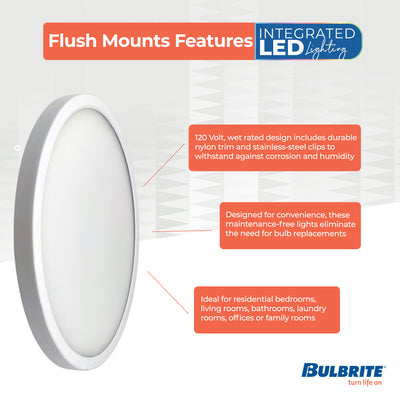 Transform any space with this versatile wet rated, modern ceiling lighting solution from Bulbrite. Our low profile, energy efficient flush mount is long lasting and easy to install. Enjoy Maintenance free lighting in any residential bedrooms, living rooms, bathrooms, laundry rooms, offices or family rooms without having to replace a light bulb.