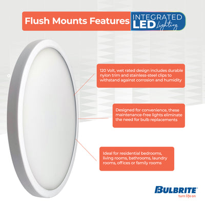 Transform any space with this versatile wet rated, modern ceiling lighting solution from Bulbrite. Our low profile, energy efficient flush mount is long lasting and easy to install. Enjoy Maintenance free lighting in any residential bedrooms, living rooms, bathrooms, laundry rooms, offices or family rooms without having to replace a light bulb.