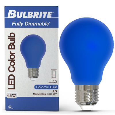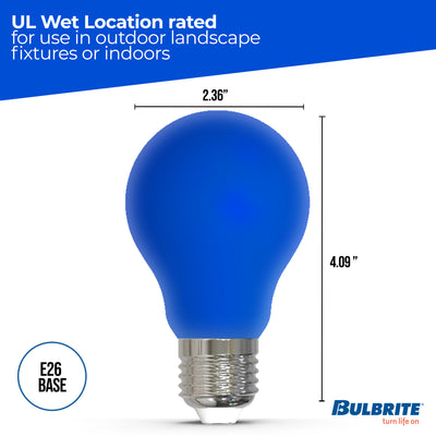 This Bulbrite LED color A19 bulb delivers a splash of blue color ideal for parties, holidays or events. These wet rated long lasting fully dimmable light bulbs are suited for indoor or outdoor use. Light up your next event or show support for your favorite charity or cause with a splash of color that lasts up to 25,000 hours.