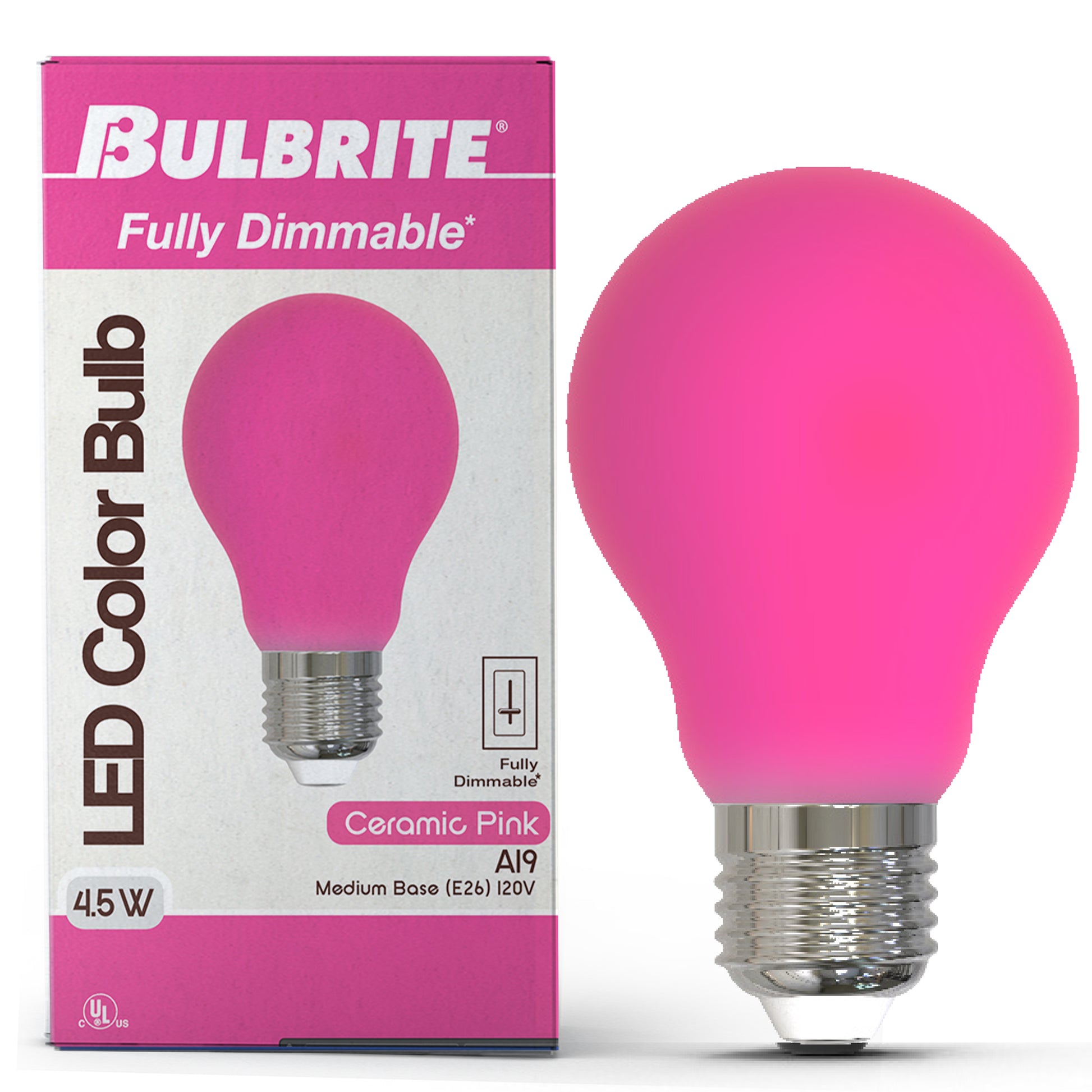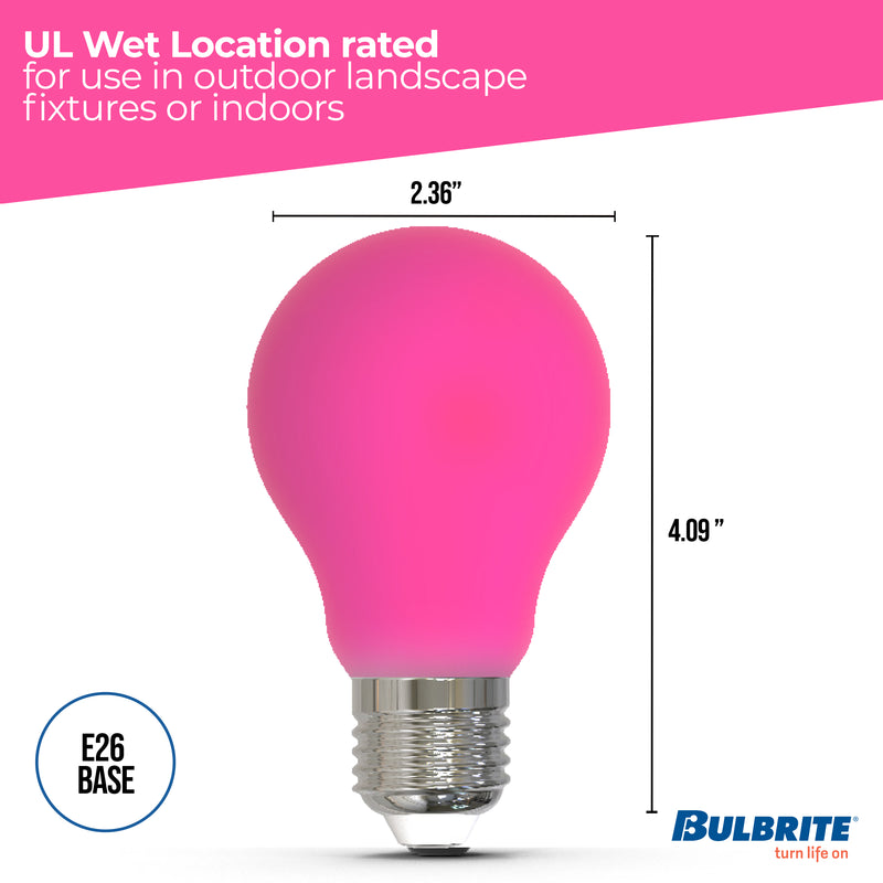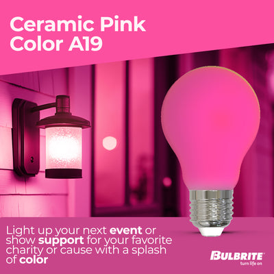 This Bulbrite LED color A19 bulb delivers a splash of pink color ideal for parties, holidays or events. These wet rated long lasting fully dimmable light bulbs are suited for indoor or outdoor use. Light up your next event or show support for your favorite charity or cause with a splash of color that lasts up to 25,000 hours.