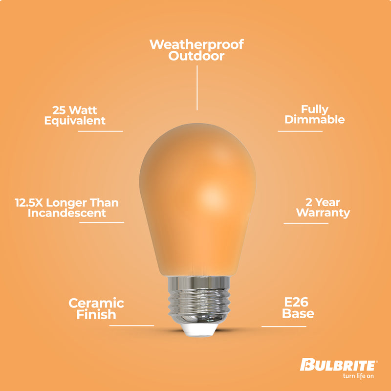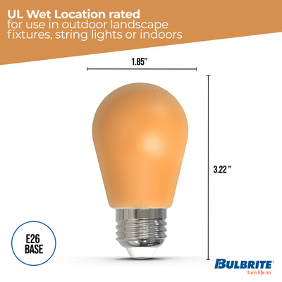 This Bulbrite LED color S14 bulb delivers a splash of amber color ideal for parties, holidays or events. These wet rated long lasting fully dimmable light bulbs are suited for indoor or outdoor use including with most string lights. Light up your next event or show support for your favorite charity or cause with a splash of color that lasts up to 25,000 hours.