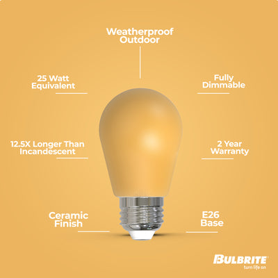 This Bulbrite LED color S14 bulb delivers a splash of yellow color ideal for parties, holidays or events. These wet rated long lasting fully dimmable light bulbs are suited for indoor or outdoor use including with most string lights. Light up your next event or show support for your favorite charity or cause with a splash of color that lasts up to 25,000 hours.