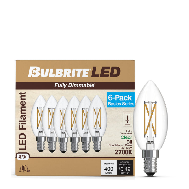 6 Pack of Bulbrite's LED B11 bulbs to enhance your space. Each bulb uses just 4.1W of power while delivering the brightness equivalent of a traditional 40W incandescent, producing 400 lumens of warm white light (2700K) with excellent color rendering. The clear finish provides sparkling clarity and visibility of the beautiful filament design, and the standard candelabra screw (E12) ensures compatibility with your existing fixtures. These dimmable bulbs are engineered for reliability, offering an impressive 15000-hour lifespan, reducing replacement frequency and maintenance costs while providing consistent, quality illumination for years to come. For over 50 years Bulbrite has grown from one man's dream to the dream of many. But the one thing that has remained the same � our company's purpose, our guiding light (pun intended!). We believe that light is so essential � so fundamental � because it impacts every moment of our lives. Our dream is to touch the lives of many by providing the most beautiful light possible as the leader in light bulb solutions. Trust in Bulbrite to brighten your space.