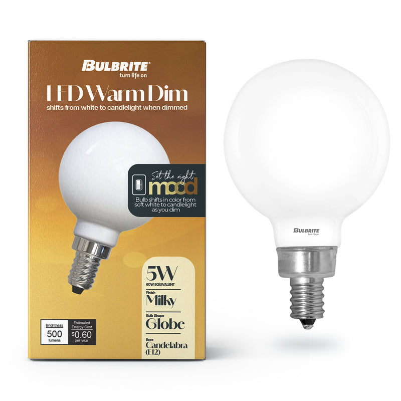 - YOU HAVE TO DIM IT TO BELIEVE IT: The Bulbrite Warm Dim collection features LED bulbs in six shapes that shift in color from soft white to candlelight as you dim them, perfect for replacing the look and feel of incandescent bulbs, compatible with a wide variety of dimmer types.