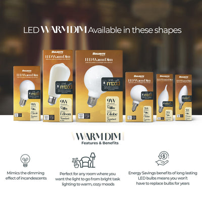 - YOU HAVE TO DIM IT TO BELIEVE IT: The Bulbrite Warm Dim collection features LED bulbs in six shapes that shift in color from soft white to candlelight as you dim them, perfect for replacing the look and feel of incandescent bulbs, compatible with a wide variety of dimmer types.