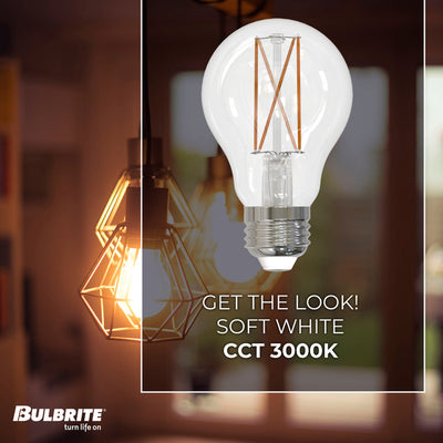 Cast the perfect soft, white light throughout any room of your home with this 4-pack of 8.5 watt pear-shaped glass A19 LED bulbs, each long lasting and compatible with your dimmer technology and fixtures, with a clear filament and an E26 standard screw base.