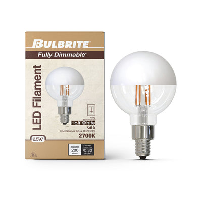 776838 - Filaments Dimmable G16 Half White Glass Candelabra Base - 2.5 Watt - 2700K - 4 Pack