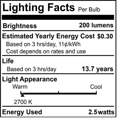 - 25 Watt equivalent, using only 2.5 Watts (200 lumens).