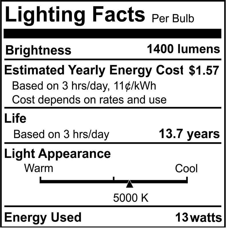 - 100 Watt equivalent, using only 13 Watts (1400 lumens).