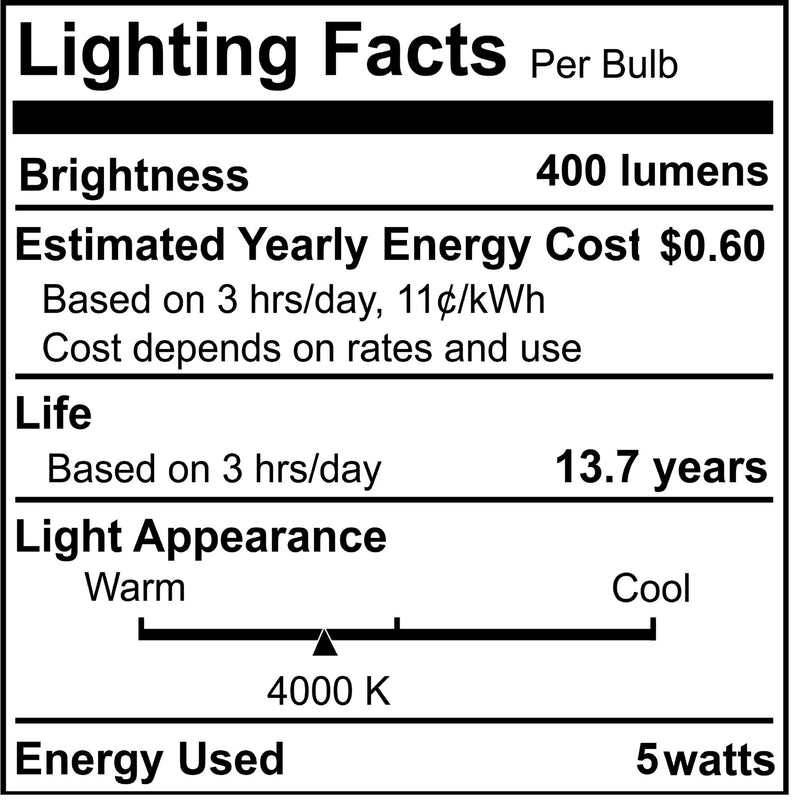 - 40 Watt equivalent, using only 5 Watts (400 lumens).