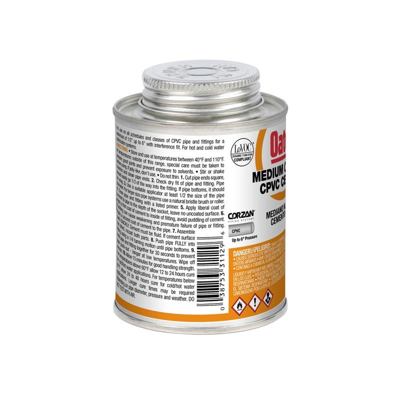 Oatey CPVC Medium Bodied Fast Set Orange Cement is recommended for cold water systems and hot water systems up to 200 degrees F / 93 degrees C. It is approved for Corzan CPVC piping systems. Its medium body has excellent gap filling properties and is easy to apply with included in-lid dauber. This orange, low VOC, fast set cement can be used to solvent weld all schedules and classes of CPVC pipe and fittings up to 6 in. diameter with interference fit. Oatey products have earned the trust of plumbing professionals for over 100 years.