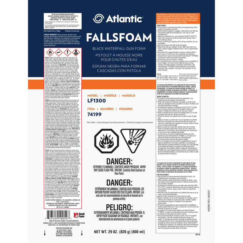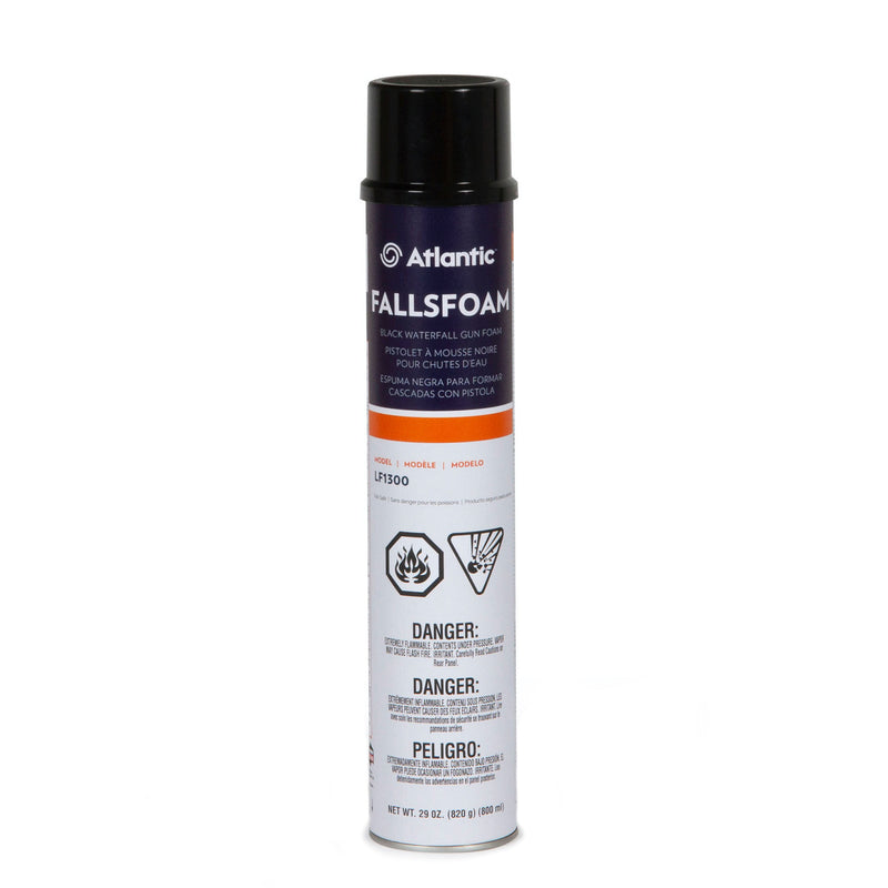 Atlantic's FallsFoam fills voids and keeps water flowing on top of waterfall rocks instead of under them. Atlantic's high density closed cell FallsFoam resists foot traffic and waterlogging. Black for lower visibility, FallsFoam resists UV deterioration and lasts for years. Foam Cleaner quickly dissolves uncured foam to keep guns and surroundings clean. The LF1100 is a DIY black waterfall foam can with applicator straw and is 12 oz. It has a 1 year from born on date shelf life.