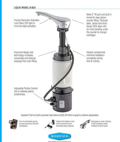 The Bobrick B824 is a SureFlo automatic, top fill bulk liquid soap dispenser. It is designed to minimize cross contamination. For significant costinuse savings, this model features a unique portion control. With this Bobrick soap dispenser, there is no need to worry about accidental activation during hand washing. That's because of this model's activation lens, which lets the unit define its activation range.When the battery life or the soap level is low, the LED light starts blinking to indicate that a battery change or refill is necessary. Also, there is no need to worry about the motor of this Bobrick soap dispenser because it is water resistant. For ease of installation, one fiber optic connector tip integrates all three plastic fiber optic cables.