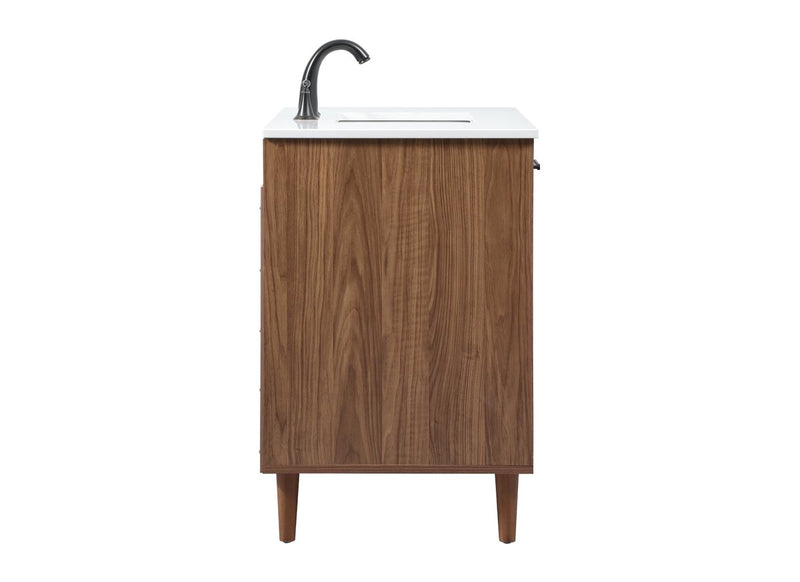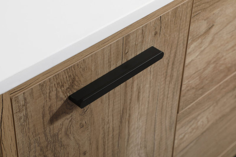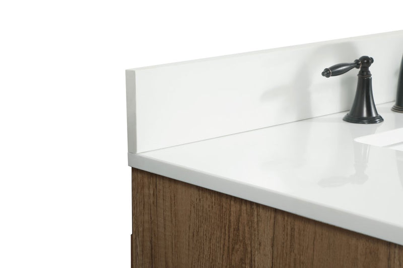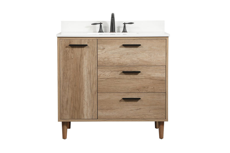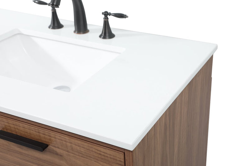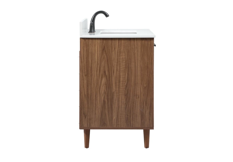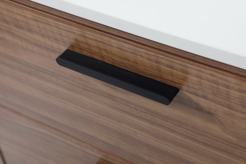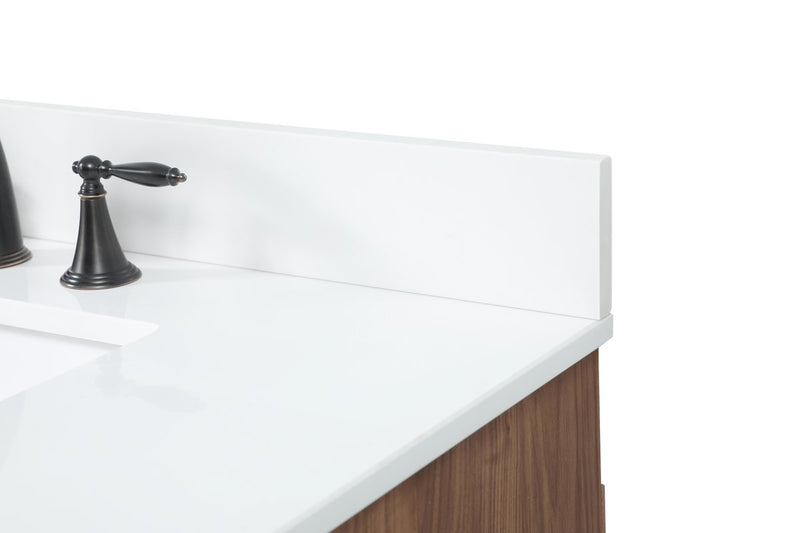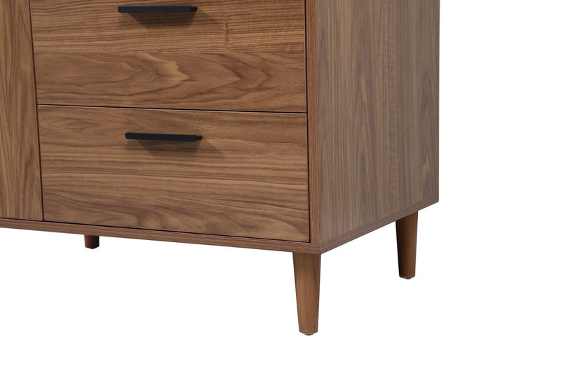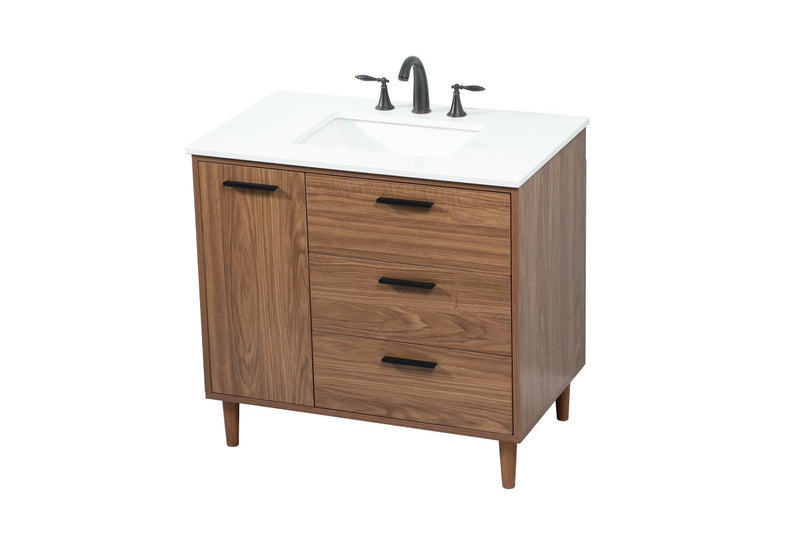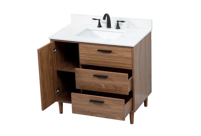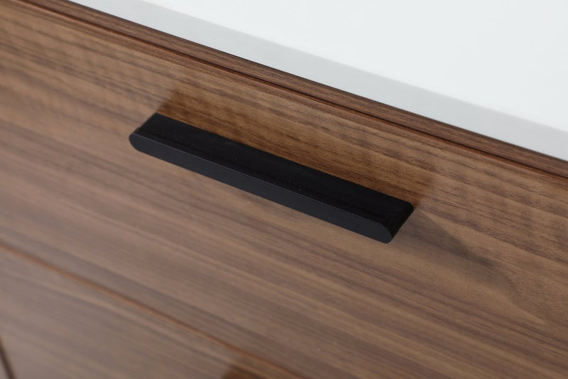 Exquisite modern sophistication is defined with the wood look and black barpulls of this vanity and slender tapered legs. Its length makes it the perfect addition to any sized home, and saves space with its storage area hidden behind the single cabinet doors and two functional drawers. Topped with a highly durable quartz countertop and a porcelain undermount sink, this modern design will become your focal point of your bathroom or powder room. Equipped with soft-closing drawer and doors adds a quiet functional touch.