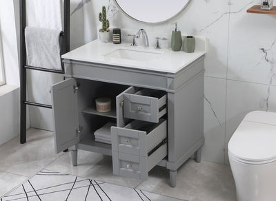 This transitional vanity is a beautiful piece of bathroom furniture will look amazing in your design scheme. The cabinet features a shaker style smooth door panel with simple round knobs and soft close hinges provide ample room for accessories. Packed with multiple side drawers with soft close glides for added comfort and full access to bath supplies. Convenient deep drawer stores all of your tall bath essentials. Constructed of engineered wood and solid wood legs with hand painted finish. The durable quartz countertop is a versatile material in an ivory white finish. Minor assembly of the legs needed to get this vanity up and running.