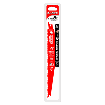 Diablo's reciprocating Saw Blades are specifically designed for maximum performance in general purpose (nail-embedded wood and metal) applications. These high performance Blades feature bi-metal technology that delivers up to five times longer life of standard Blades on the market. Diablo's's patented variable tooth technology provides faster cuts with less vibration.