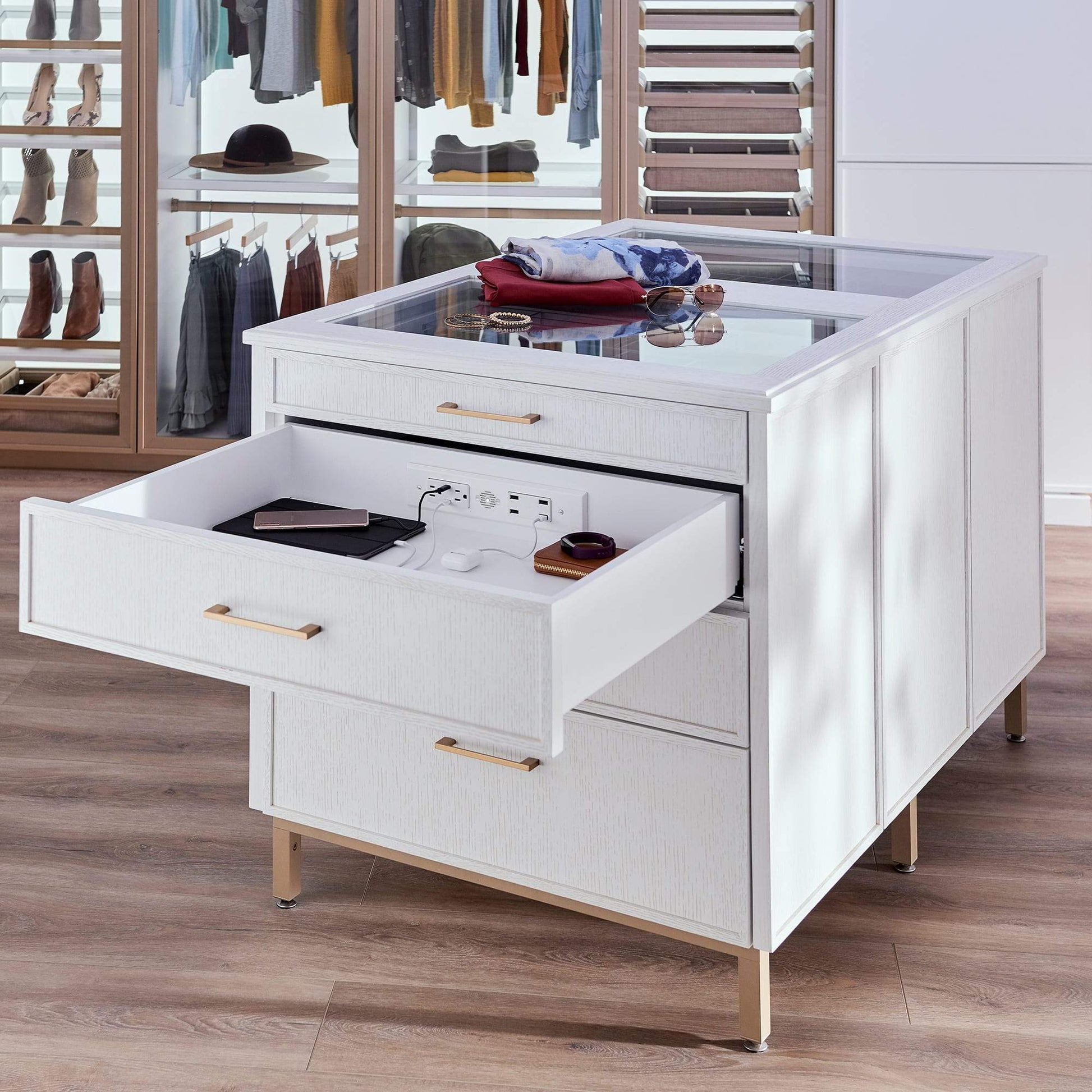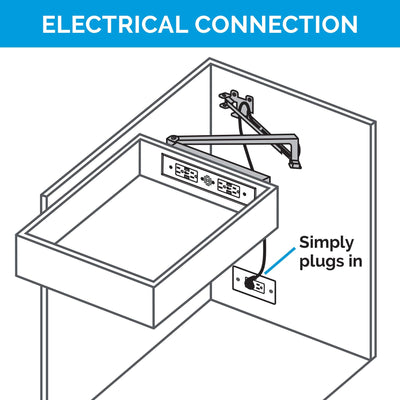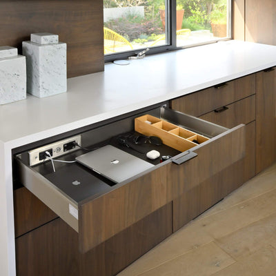 Docking Drawer outlets offer a safe and reliable way to add electrical outlets into cabinet and furniture drawers, clearing cord and device clutter from visible surfaces. Docking Drawer outlets can enhance the organization of any home or commercial space, while devices remain conveniently plugged in and at the ready. Create clutter free and organized spaces with safe in-drawer electrical outlets. Perfect addition to any kitchen, bathroom, vanity, nightstand, or office project. Will charge every type of technology or power hair dryers, curling irons, stand mixers and more.