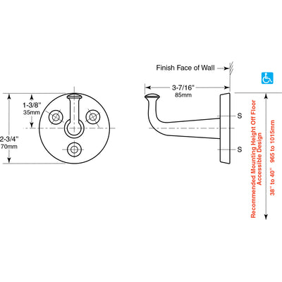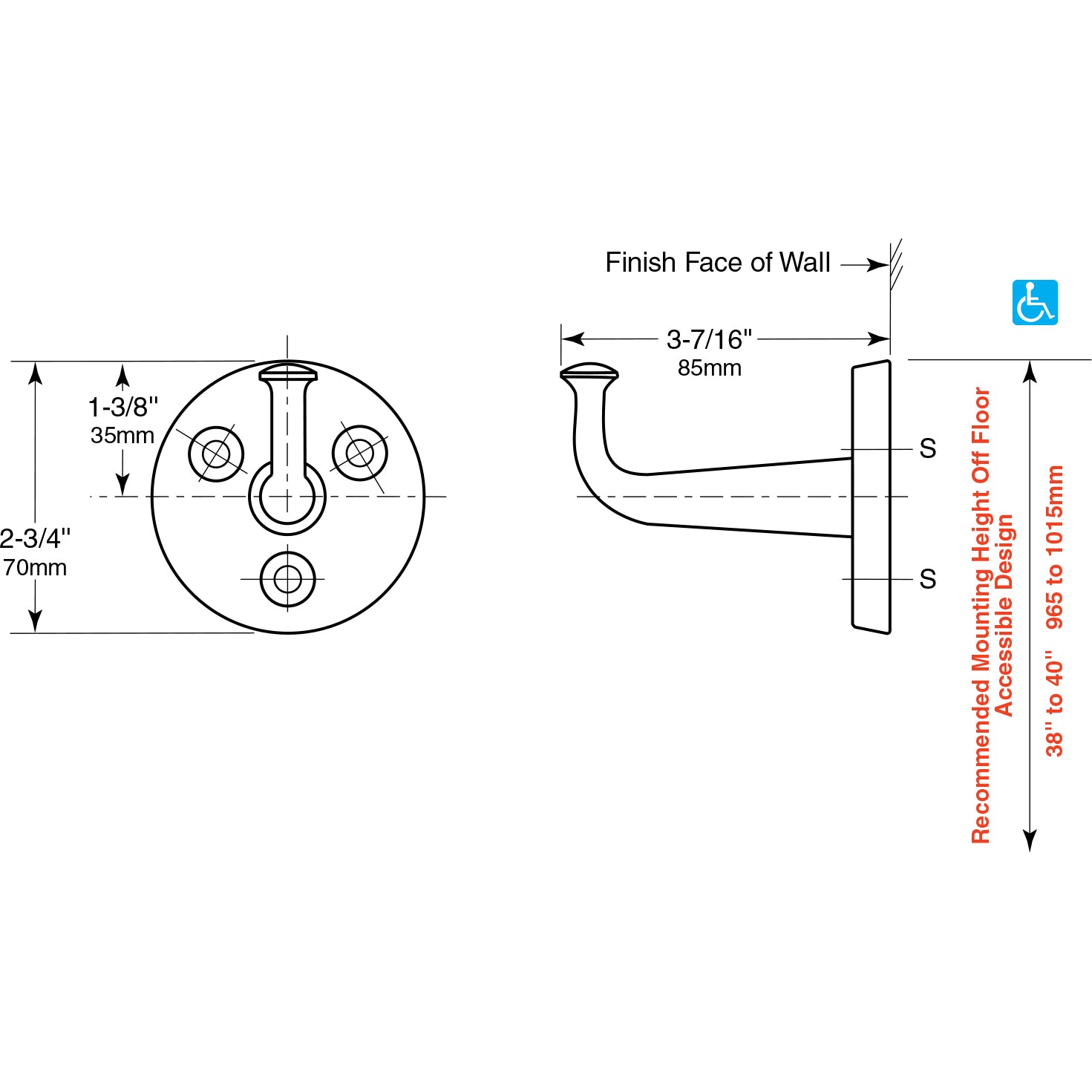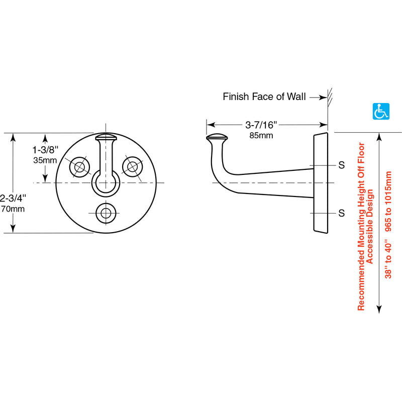 Mount unit on wall with three sheet-metal screws, furnished by manufacturer, at points indicated by an S. For plaster or dry wall construction, provide concealed backing to comply with local building codes, then secure hook with screws furnished. For other wall surfaces, provide fiber plugs or expansion shields for use with screws furnished, or provide toggle bolts or expansion bolts.