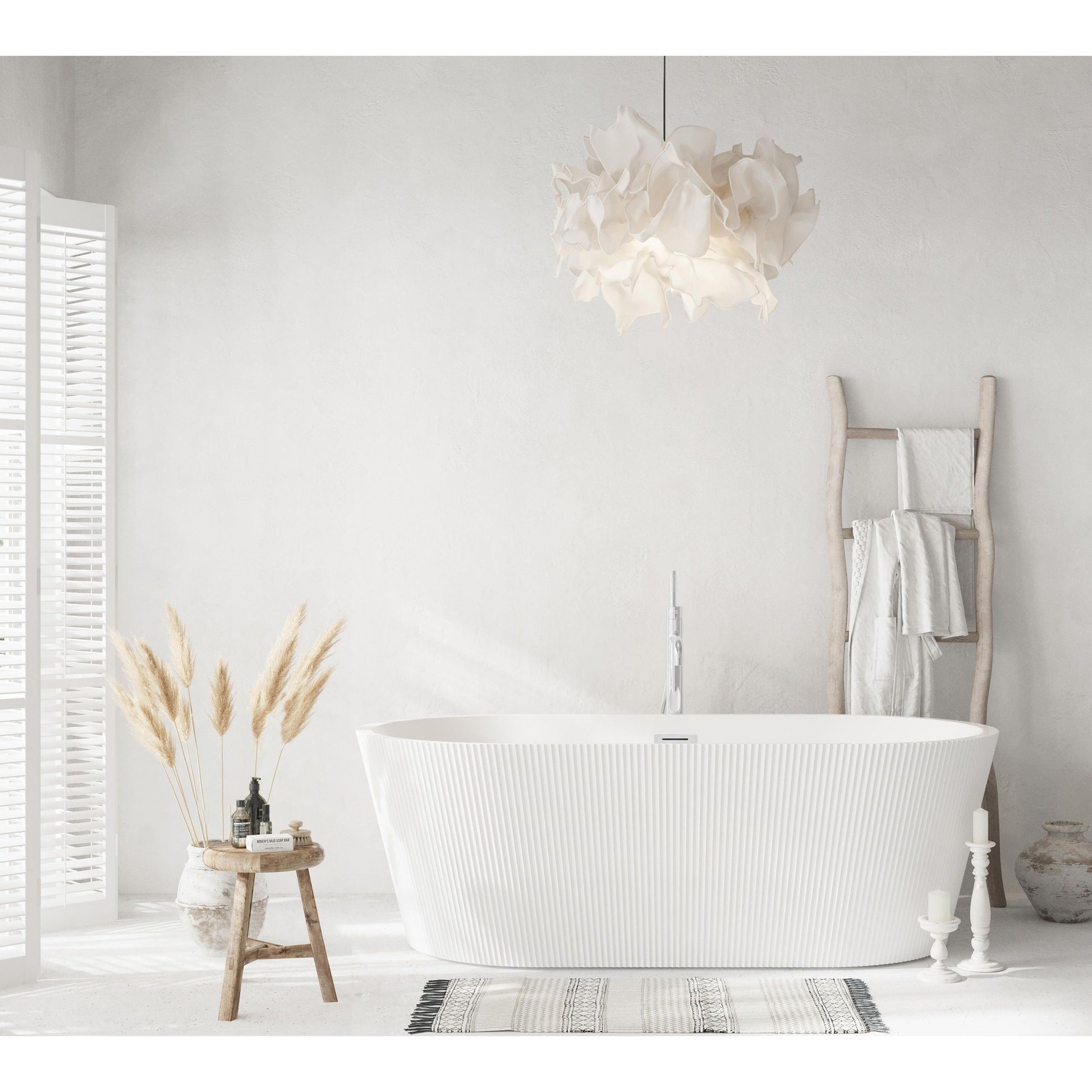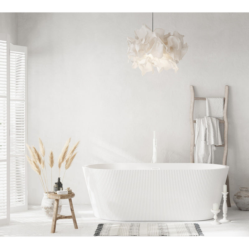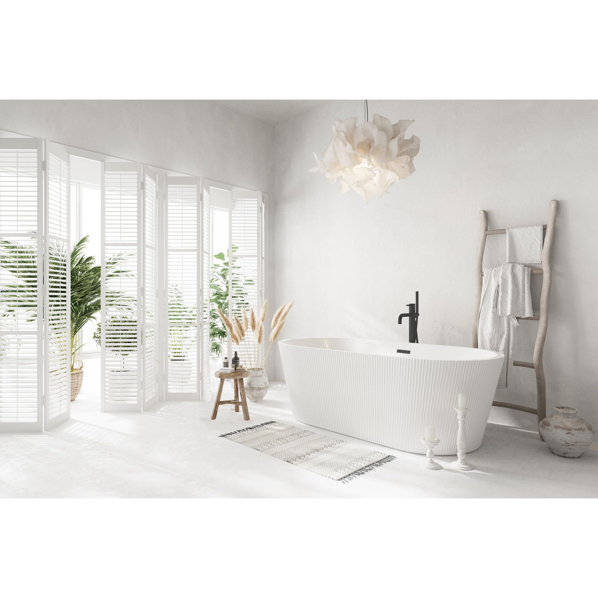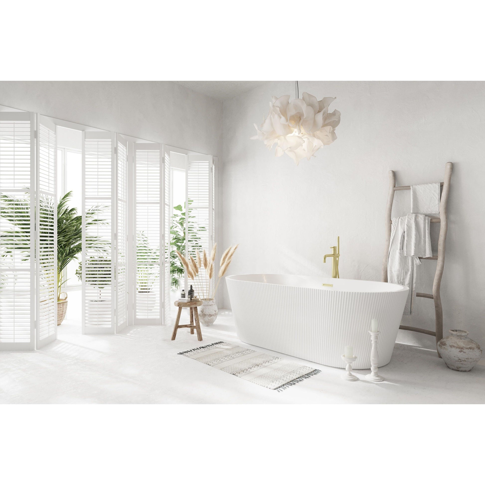Immerse yourself in the ultimate relaxation experience with this elegant freestanding soaking bathtub, featuring a beautifully textured vertical fluted design that adds a touch of sophistication to your bathroom. The smooth, rounded rim offers comfortable arm support, making it the ideal spot to unwind. Equipped with a pop-up drain and integrated overflow, this tub seamlessly combines convenience and style. With a generous capacity and 15-inch soaking depth, it's perfect for those looking to indulge in a deep, luxurious soak. Available with customizable drain trim finishes like brushed gold, matte black, and more, this bathtub is designed to fit your unique style. Durable and easy to install with adjustable foot levelers, this tub is both a statement piece and a functional retreat in your home.