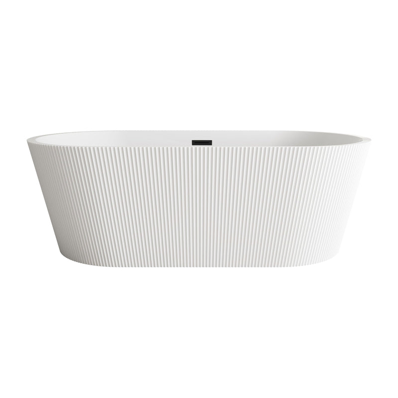 - Elevate your bathroom's aesthetic with this stunning freestanding soaking bathtub, featuring a vertical fluted exterior design that adds texture and sophistication to any space.