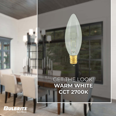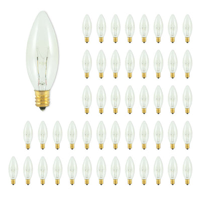 This 50 pack of incandescent bulbs is great to have on hand for any small chandelier in your home or commercial space. Each B8 bulb has an E12 screw base. These bulbs are fully dimmable and emit a warm white light. Choose a long lasting incandescent bulb with this classic, slender shape to highlight your home's existing fixtures and set the perfect mood for any room or occasion.