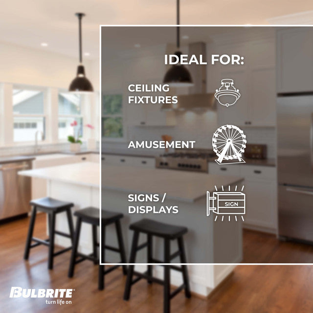 - MULTIPLE USES: Ideal for amusement and theatrical lighting, these low wattage bulbs use less energy than the average incandescent and are considered long lasting and reliable. Commonly seen in string lights for outdoor use, on your patio and in the cafe. Use for holiday lighting, parties and exterior decorating.