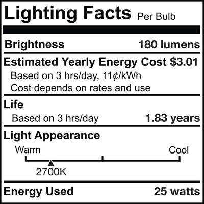 - SPECIFICATIONS: Included in the box are 25 individual incandescent bulbs. Each T6 candelabra bulb has an E12 screw base. These bulbs are 25 watts each and fully dimmable. They are rated at 2700K. These bulbs are ideal for appliances and signage. Their dimensions are 2.88 x 0.75 x 6 inches.