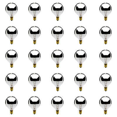 - SPECIFICATIONS: Included in the box are 25 individual 25 watt incandescent bulbs. Each bulb is fully dimmable with a half chrome globe. These G16.5 bulbs have a standard E12 screw base and are rated at 2700K. Dimensions are 14.7 x 4.2 x 4.8 inches.