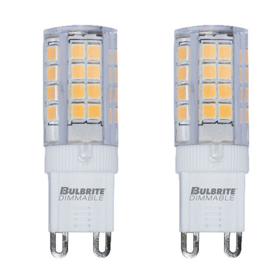 - SPECIFICATIONS: Included in this package are two, 4.5 watt mini T4 bulbs. Each bulb is dimmable with a bi-pin G9 base. At 4.5 watts, these LED bulbs are the equivalent of a 35 watt bulb. Each of them have 400 lumens, 80 CRI and 3000K. Each bulb is 2.17 Inches with a diameter of 0.71 Inches.