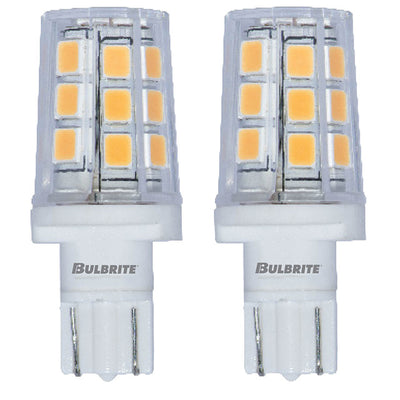 - SPECIFICATIONS: Included in this purchase are two individual LED bulbs. These T3 bulbs come with a wedge base. They are 2.5 watts each but operate like a 20-watt incandescent bulb. Each bulb is rated at 3000K for a soft white light. Dimensions for each bulb are 1.46 x 0.59.