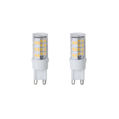 - SPECIFICATIONS: Included in this package are two individual, 4 watt mini T4 bulbs. Each bulb is dimmable with a bi-pin G9 base. At 4 watts, these LED bulbs are the equivalent of a 20-40 watt bulb. Each of them has 450 lumens, 80 CRI and 2700K.