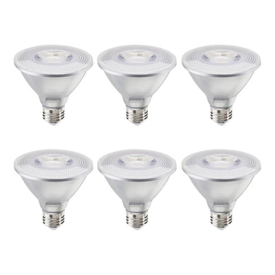- SPECIFICATIONS: Included in this package are six individual LED bulbs. Each narrow flood PAR30SN bulb has a standard E26 screw base. They are fully dimmable and 10 watts each. These bulbs are 3000K, 90 CRI and 800 lumens.