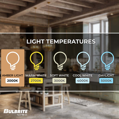 - AMBER LIGHT: With a Kelvin score of 2200 each, these bulbs emit a warm amber light. This rating means your lamp or ceiling fixture will emit a perfect amount of light that is not too dim and not too harsh. They're also fully adjustable meaning you can control the ambience of your room.
