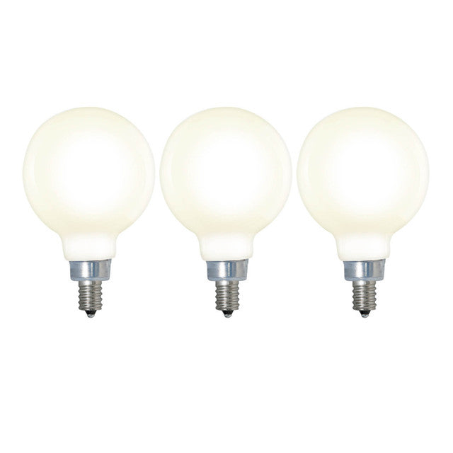Included in this package are three individual LED bulbs. Each G16 bulb has an E12 screw base. LED filaments for long life and extreme energy efficiency. Much like frosted glass bulbs, milky glass bulbs diffuse lighting for a more even effect unlike direct light from clear glass bulbs. The milky finish also adds a modern touch to the unique G16 sphere shape of the bulb. Great in pendants, lamps and sconces where the bulb is visible.