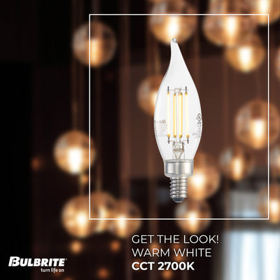 The Bulbrite 5W LED CA10 2700K Filament Bulb offers a classic candle flame look for your chandeliers or other portables or ceiling fixtures with a cone-shape and bent tip. The clear finish offers prominence to the bulbs in your fixtures with a uniform glow for your space.