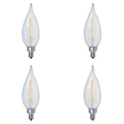 - SPECIFICATIONS: This is a 4-pack of 4.5 watt dimmable CA10 candelabra bulbs with clear LED filaments, perfect for use in any chandelier or decorative candle like fixture. Each bulb is made of clear glass with a screw base in size E12. Bulbs emit 350 lumens, 3000K and 90 CRI.