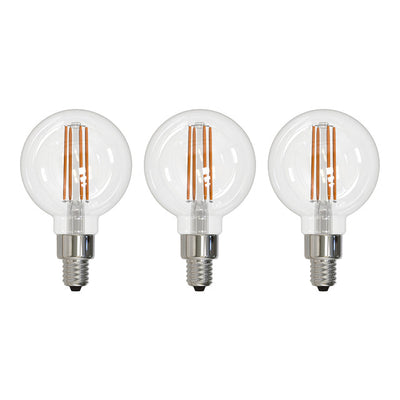 Features Pack of (3) bulbs Capable of being dimmed Vintage Edison style bulbs provide a unique appearance to any fixture Rated for damp locations Electrical Specifications Bulb Base: Candelabra (E12) Bulb Type: LED Bulb Shape: G16 Wattage: 4 watts Voltage: 120 volts Lumens: 350 Color Temperature: 3000K Color Rendering Index: 80 Average Hours: 15,000