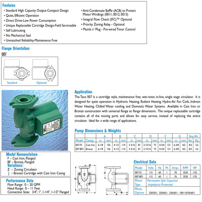 Taco 007-F5-7IFC - Cartridge Circulator - Cast Iron - Integral Flow Check - 1/25 HP - Flanged