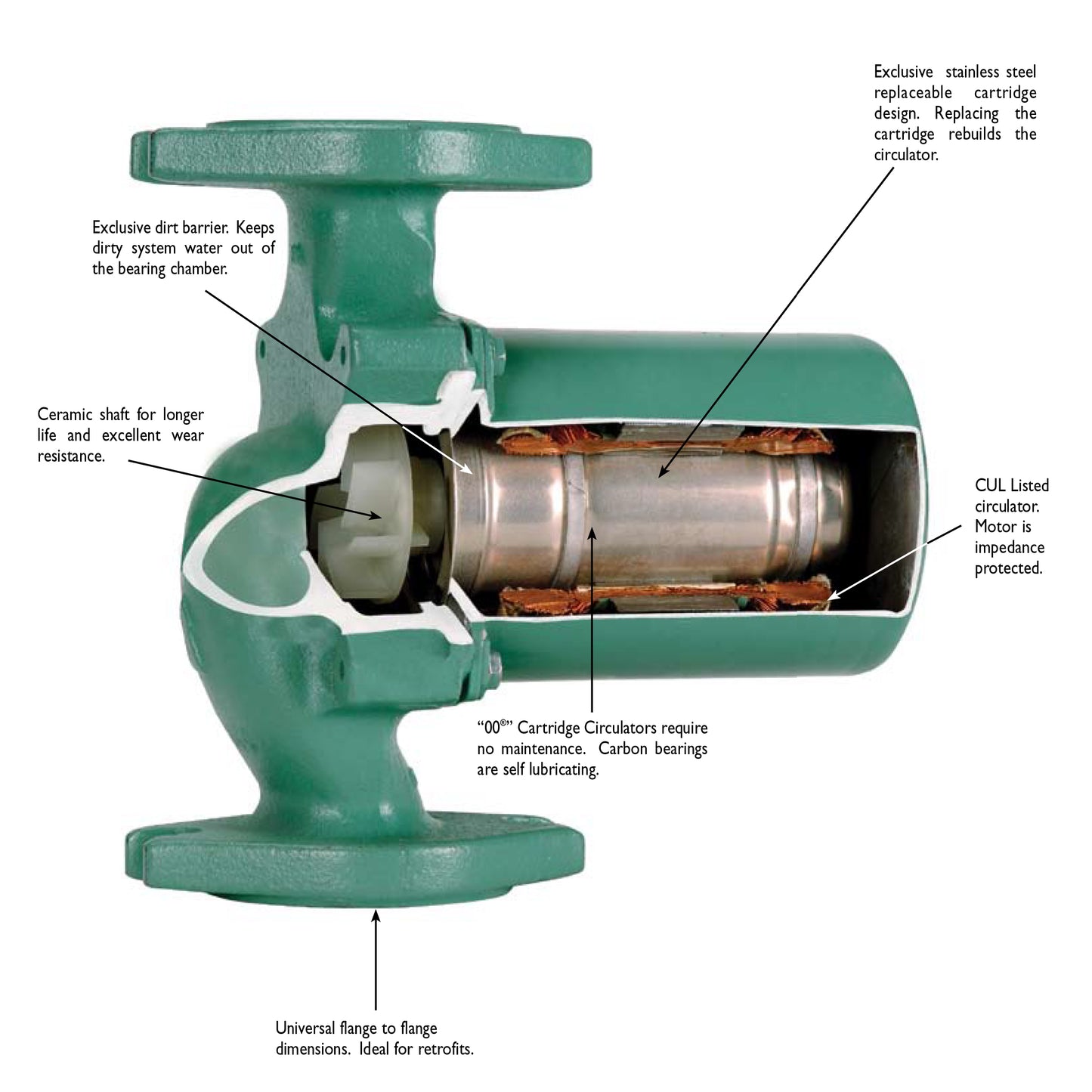 The 007-IFC is designed to simplify piping, reduce installation costs and improve system performance when zoning with 00 circulators. By locating the IFC inside the pump, a separate in-line flow check is eliminated. The low pressure drop of the IFC increases flow performance vs. in-line flow checks. Both the IFC and the cartridge are easily accessed for rem