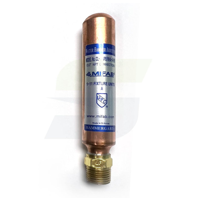 MIFAB CL Series piston operated water hammer arrestor with hard drawn seamless "K" copper body, RYTON PPS piston with double o-rings (Parco # 5778-80) and CDA 360 brass M.P.T. connection. Certified to the A.S.S.E. 1010-1996 and ANSI A112.26.1M Standards.