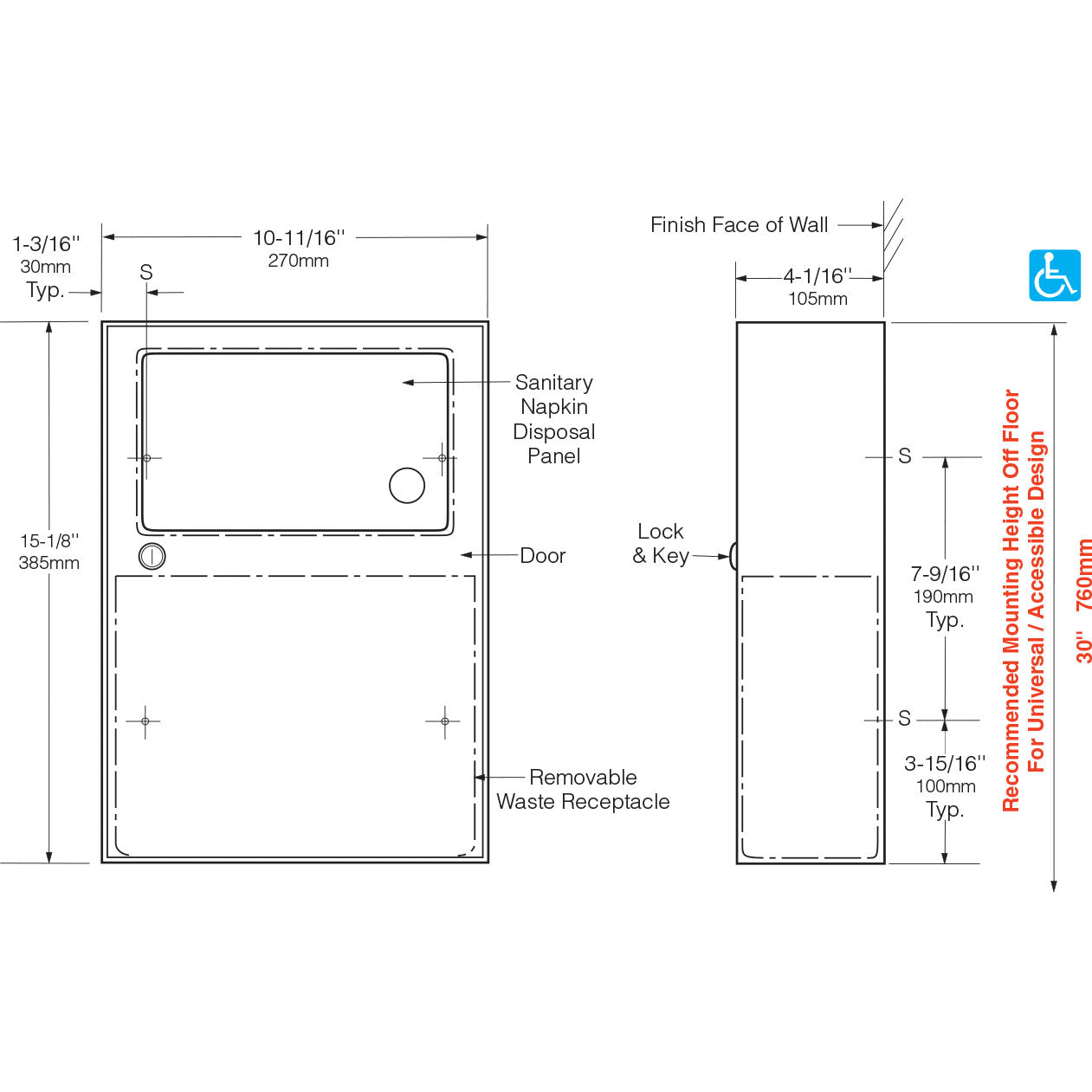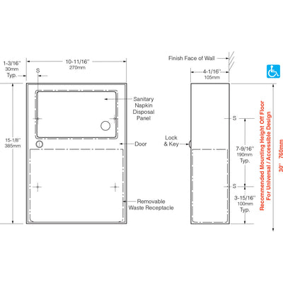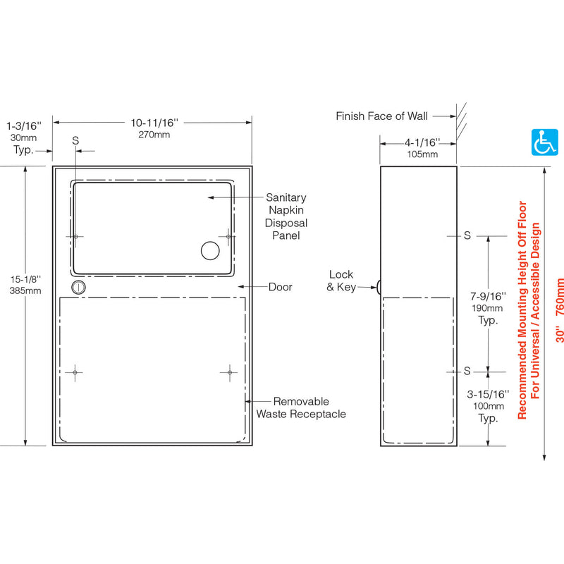 - Disposal Panels (2) — 18-8, type-304, 22-gauge (0.8mm) stainless steel with satin finish. Bottom edges hemmed for safety. Secured to door and permanent panel with spring-loaded, full-length stainless steel piano-hinge. Equipped with international graphic symbol identifying sanitary napkin disposal.