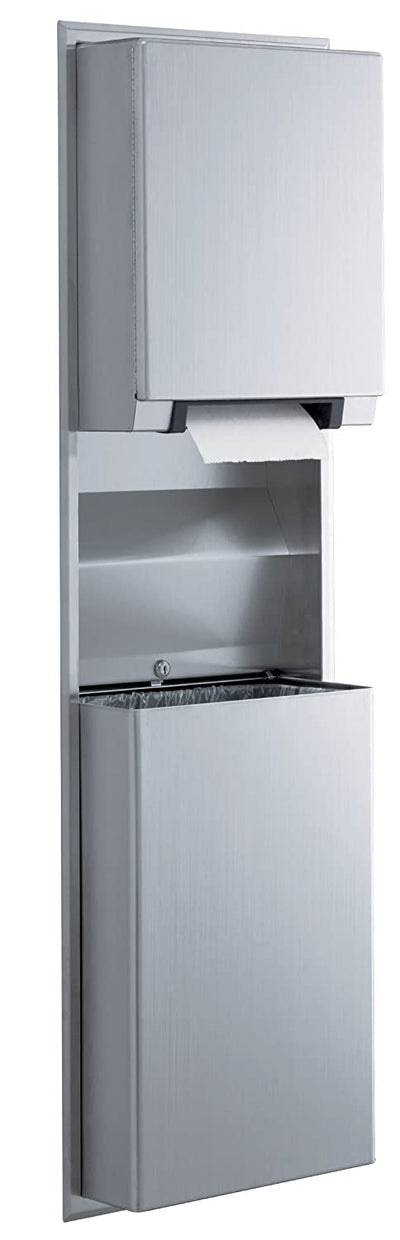 - Unit includes convertible automatic universal, roll paper towel dispenser with intuitive, patron-friendly light that directs users to towel activation zone and 12-gallon (45.5-L) waste receptacle. Satin-finish stainless steel.